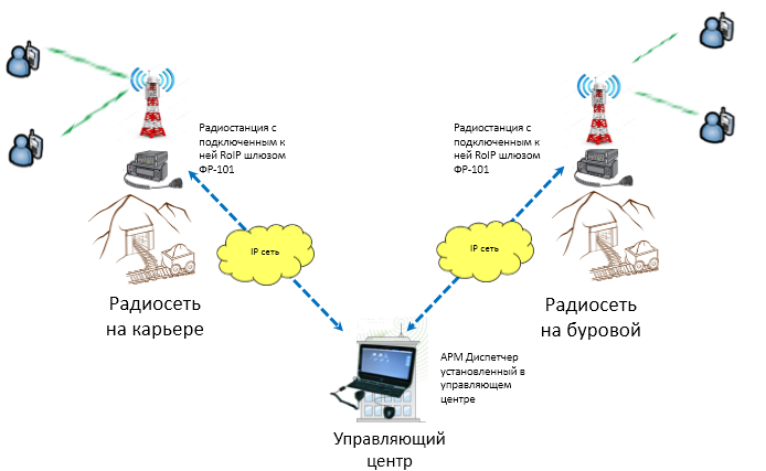 Схема работы шлюзов Радиошлюз RoIP-01 и АПК СУРА. Количество шлюзов может быть более 2-х,и ограниченно только количеством радиосетей.